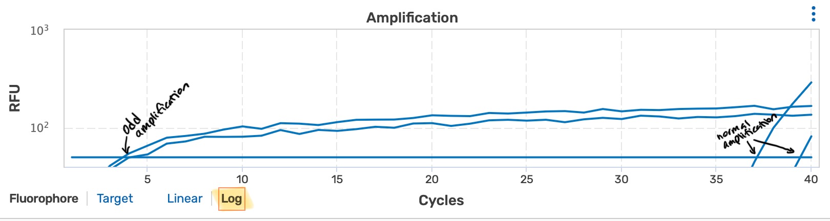 - for unknown reasons (possibly due to contamination in the qPCR machine), there is a change that samples where very low or no amounts of DNA will amplify very early in the cycles but not increase the same as normal amplifications; if this occurs exclude any odd amplification replicate/well from analysis